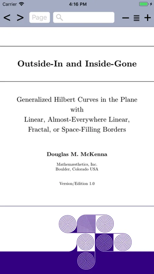 Designed for high-school or college students, math professionals, and any math-curious person interested in two-dimensional design patterns and space-filling curves and/or fractals, the app presents you with over 130 illustrations in the form of a 160-page electronic document entitled "Outside-In and Inside-Gone". The illustrator, author, researcher, and programmer is Douglas McKenna, an award-winning software developer, mathematical artist, and fractal pioneer and space-filling curve researcher whose career started by drawing space-filling curve illustrations for the father of fractals, Benoît Mandelbrot.