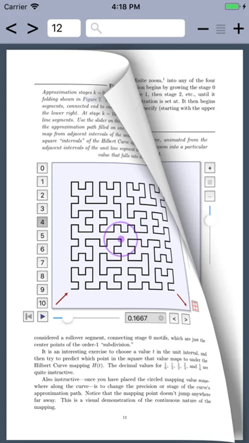 Hilbert Curves is a unique app in the form of a book that shows, explains, and lets you explore and play with one of the most famous and elegant constructions in mathematics, Hilbert's space-filling curve. It shows how to map the points from a line segment to every point inside a square, as a continuous curve. You can do an animated infinite zoom into its construction, or explore the mapping interactively at different levels of precision to understand how it works as a continuous curve.