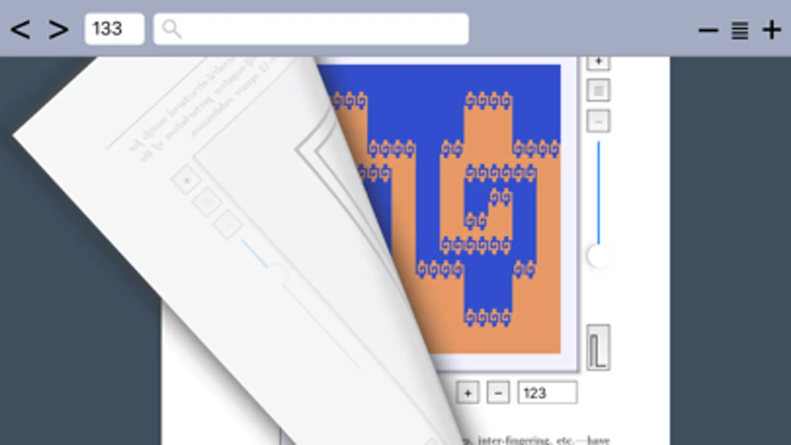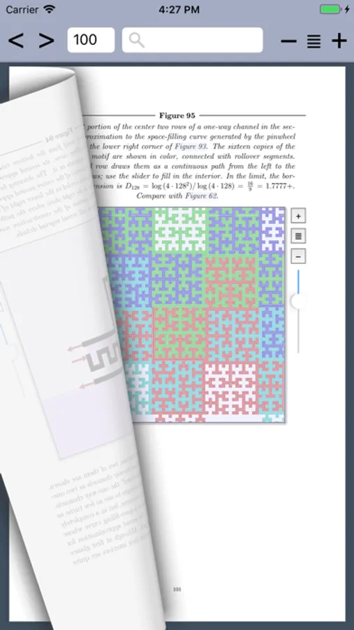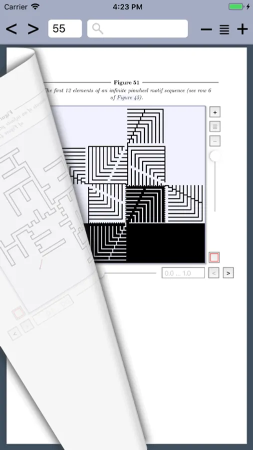 But this app does not (and cannot) use any PDF or other vector files for its resolution-independent illustrations. Instead, it internally self-typesets the text and math at application launch time to the highest (TeX-quality) standards at the same time as presenting the reader with independently zoom-able pictures embedded in the text. Most of these pictures are parameterized with various controls or are animated so that you can interact with and better understand the visual constructions. Many illustrations with tens of millions of connected lines in them can be constructed on the fly and deeply zoomed into, independently of the text, so that you can explore and understand the myriad tiny details and structure.