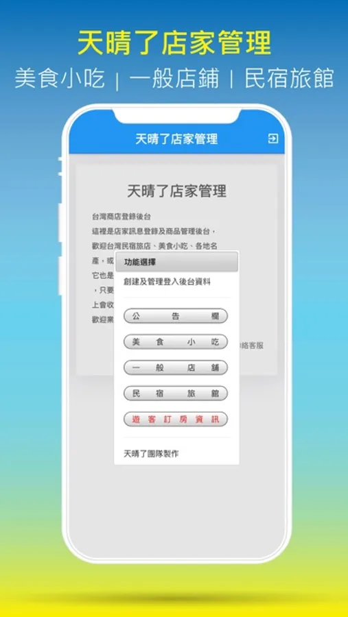 這裡是店家訊息登錄及商品管理後台,歡迎台灣民宿旅店、美食小吃、各地名產,或精品商店均可登錄。
