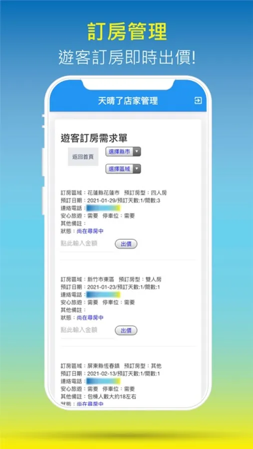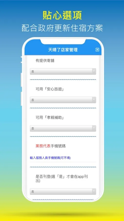 它也是台灣旅宿業者最好的行銷好幫手,只要客人提出訂房需求,旅宿業者馬上會收到通知,並與業者進行對話!歡迎業者加入天晴了店家後台系統。