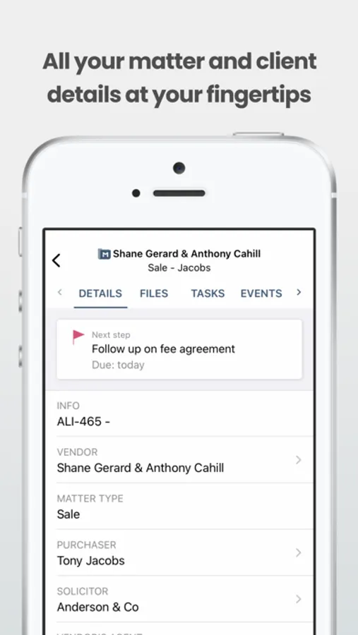 View the pertinent details, parties, emails, documents, events and tasks for each matter.