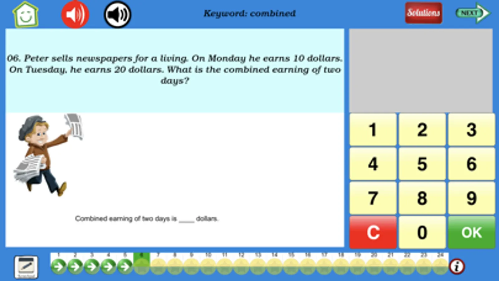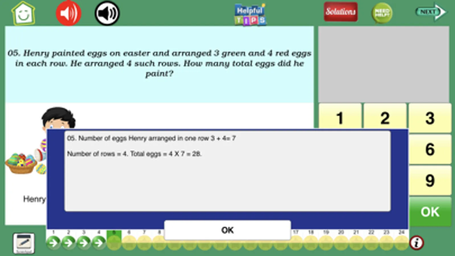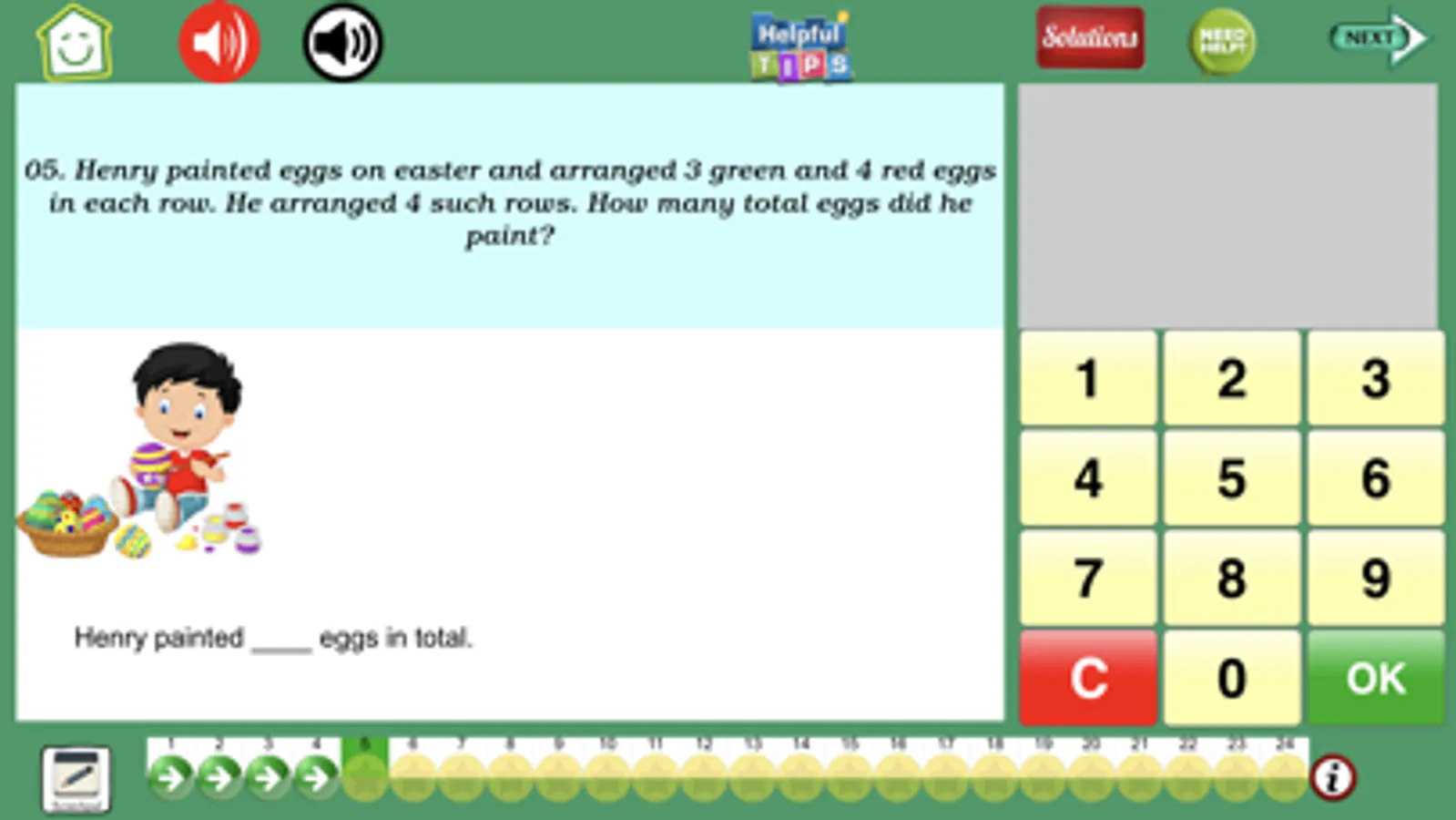 The problems are divided into 7 levels starting from beginner level where the child can drag and drop items to calculate to solving problems involving multiple steps and multiple operations.