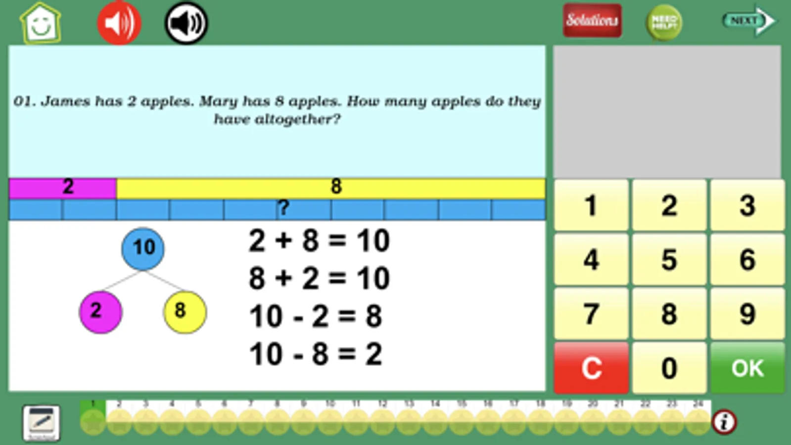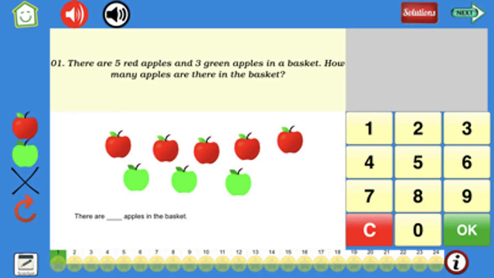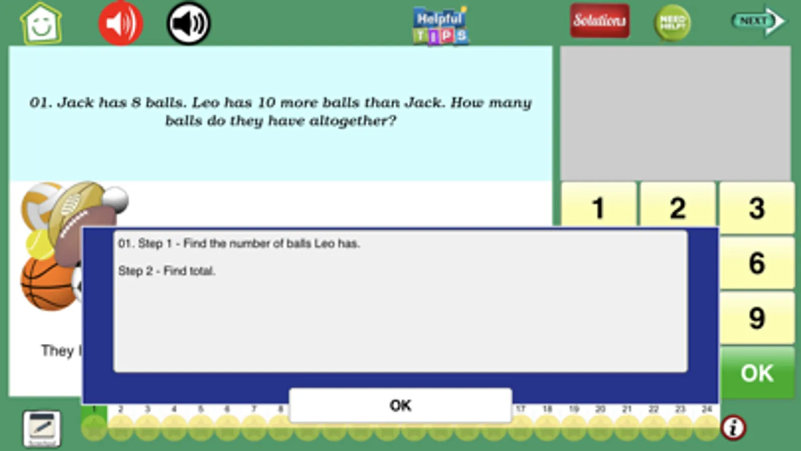 The problems are divided into 7 levels starting from beginner level where the child can drag and drop items to calculate to solving problems involving multiple steps and multiple operations.