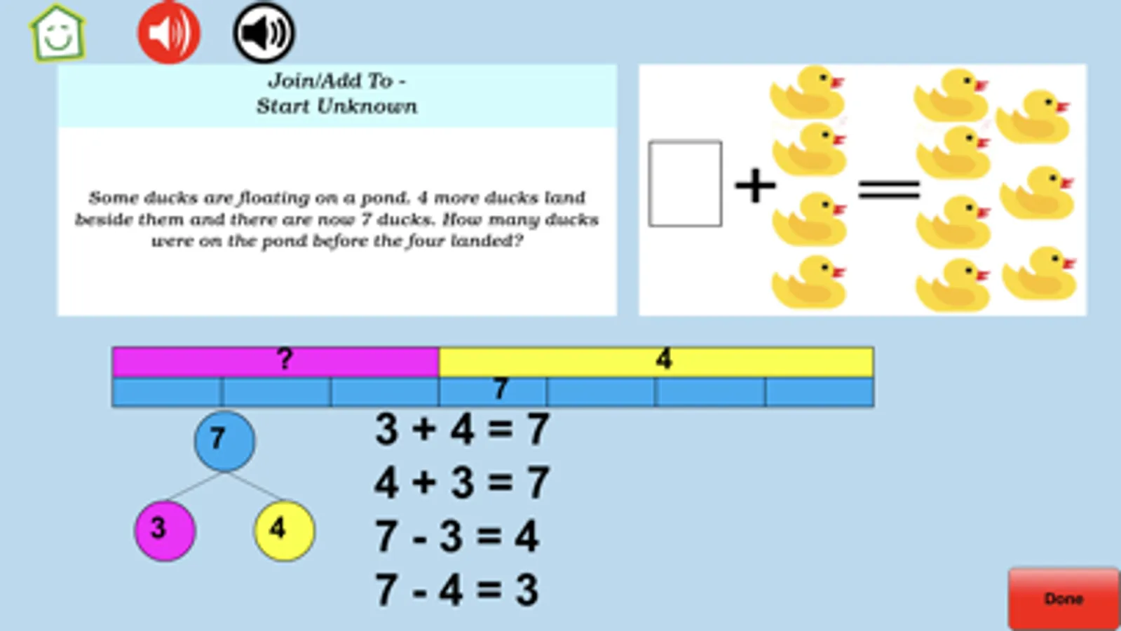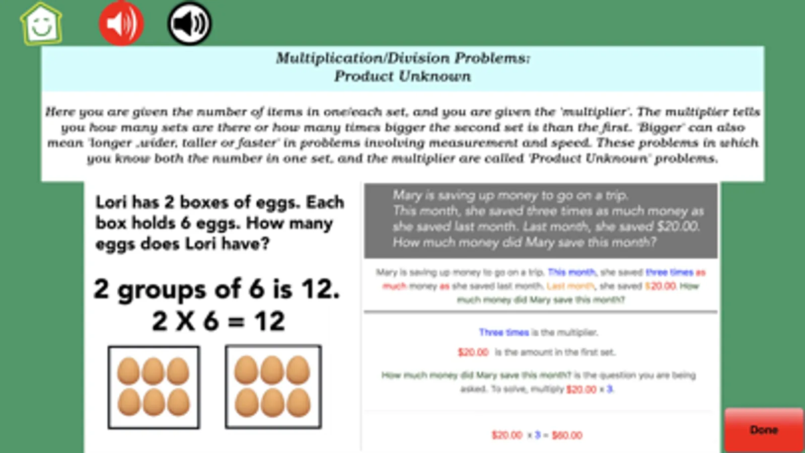 This app includes a wide variety of addition, subtraction, multiplication and divison word problems designed for students to listen, read, draw and solve. All the problems are read (can be muted also). Scratchpad is provided for doing calculations.
