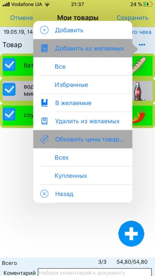 Для учета планируемых и фактических покупок используется документ «Мои покупки», который заполняется товарами, их количеством, ценой, единицей измерения товара. В документе имеется возможность