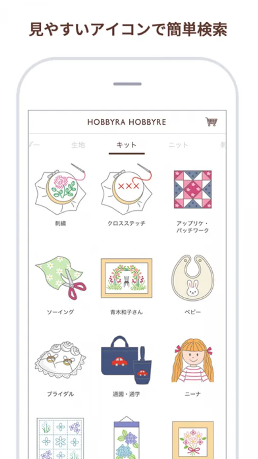 5千点以上のアイテムから、生地や毛糸、刺繍キットなど、見やすくてかわいいアイコンで簡単に検索できます。