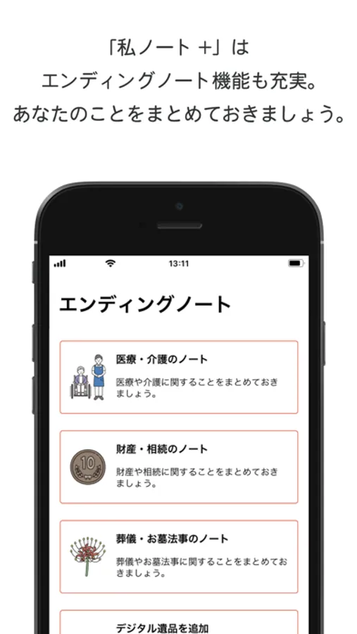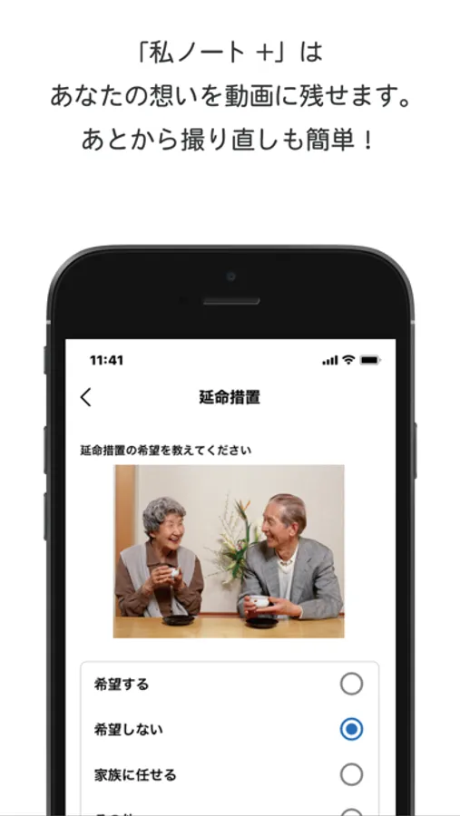 介護や葬儀などに関して、あなたに万が一のことが起きた時に伝えたいメッセージをiPhoneやiPadのカメラを使って動画として残しておくことができます。