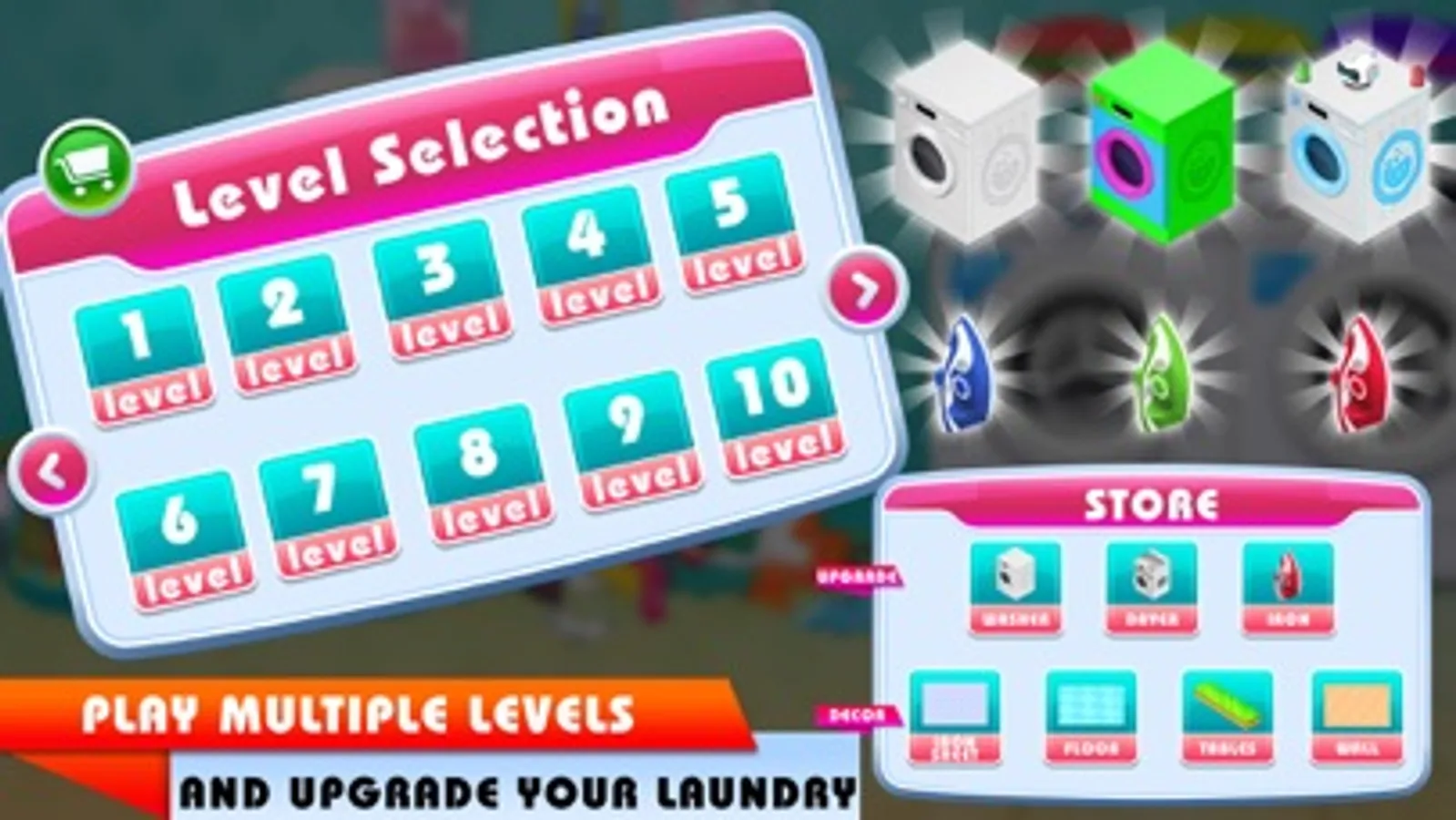 My laundry manager shop is a multiple level time management game. In this game you need server a lot of customers queuing up in the store for laundry service like clothes cleaning, drying & ironing. Serve each customer in time to get coins on cash counter and complete levels. Serve more and more customers to unlock washing machines and other stuff. Every next level presents more challenges & excitement.