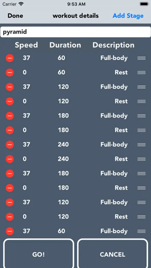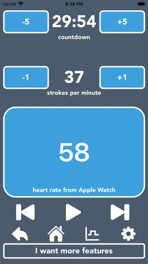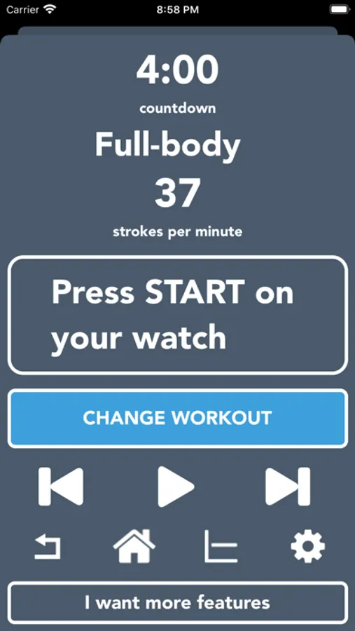 Set your total exercise time and stroke rate, hit start and away you go! Use the built in starter workout or customise your own with varying speeds and durations, add or remove stages, shuffle them around, change values and rename to suit your fitness requirements.