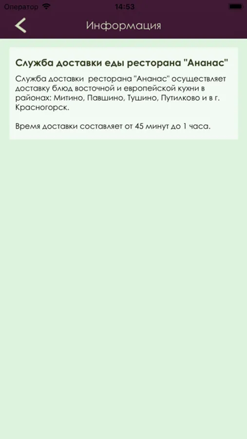Ресторанный комплекс «Ананас» - доставка еды Установив наше приложение, вы сможете заказать суши, пиццу, блюда европейской и восточной кухни с доставкой в пару кликов! В приложении имеется фото и подробное описание наших блюд. Вы можете не только заказать еду с доставкой, но и узнать об акциях нашего ресторанного комплекса. Ресторанный комплекс «Ананас» существует с 2002 года. С момента открытия мы первые предложили услугу по доставке еды из ресторана. Наш комплекс на протяжении уже более 13 лет уделяет особое внимание поддержанию высоких стандартов обслуживания и качества приготовленных блюд. Служба доставки "Ананас" обеспечит едой и напитками любое Ваше торжество или деловое мероприятие в районах: Митино, Павшино, Тушино, Путилково и в г. Красногорск. Время доставки составляет от 45 минут до 1 часа. Целый ряд компаний заказывают у нас бизнес-ланчи для своих сотрудников. Предлагая Вам наши услуги по доставке еды и напитков, мы уверены в том, что Вы не только получите удовольствие от кухни, оцените наш сервис, но и станете нашими постоянными клиентами. Позвоните нам по телефону 8(495) 759-99-39 и наши консультанты помогут Вам с выбором.