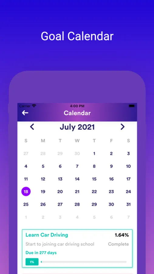 • Calendar screen show your Goal Start Dates and Goal Activity What is your Goal and How Many days to