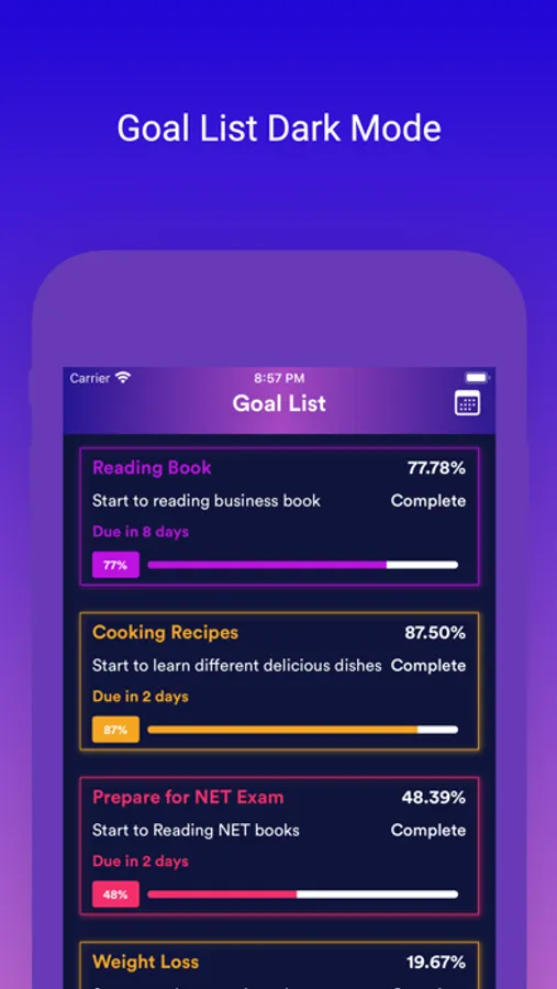• In Goal List you will see How Much Perfect you Track your goal and how much you miss your Goal.