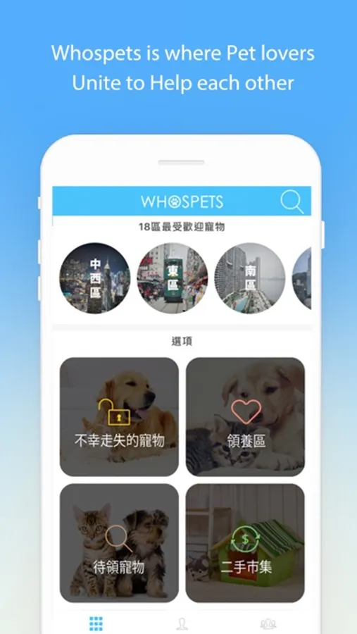 1. 當您的寵物不幸走失時,您只需更改您的寵物狀態為[走失],WHOSPETS就會通過手機APP發出通知給您區內的其他寵物主人。多一個人就多一分力,一起幫下眼!給不幸走失的寵物多一個機會回家!