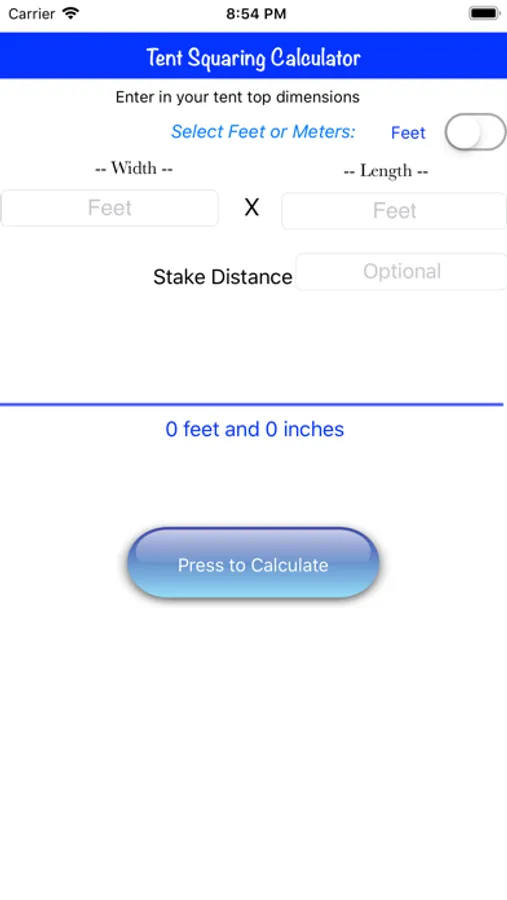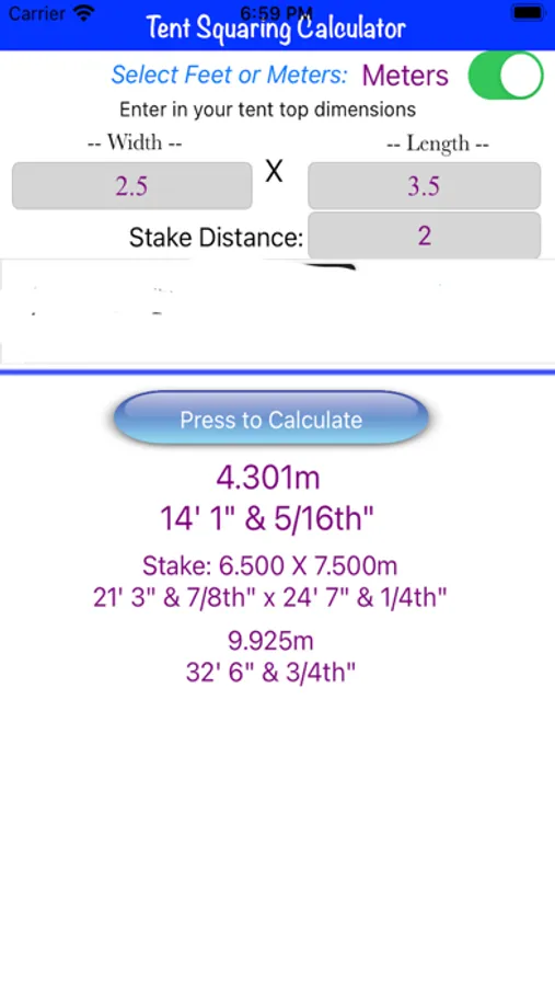Hence, this small app to come to the rescue. Select Feet or Meters. Put in the width and length of the tent top, press the button and done.