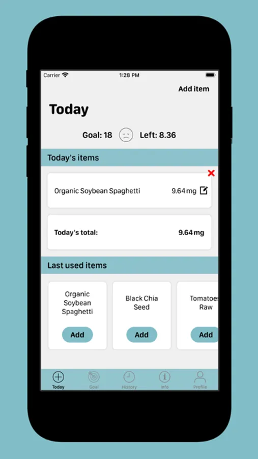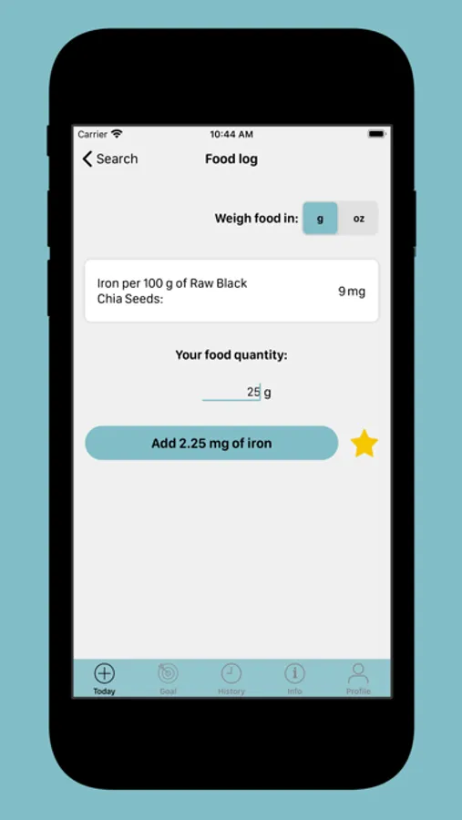 You start by setting your goal, which you can adjust in time, and then search for foods you eat during the day to see their iron content. You log them in your today's list to keep track of how much iron you've had and how much more to go until you reach your goal for the day.