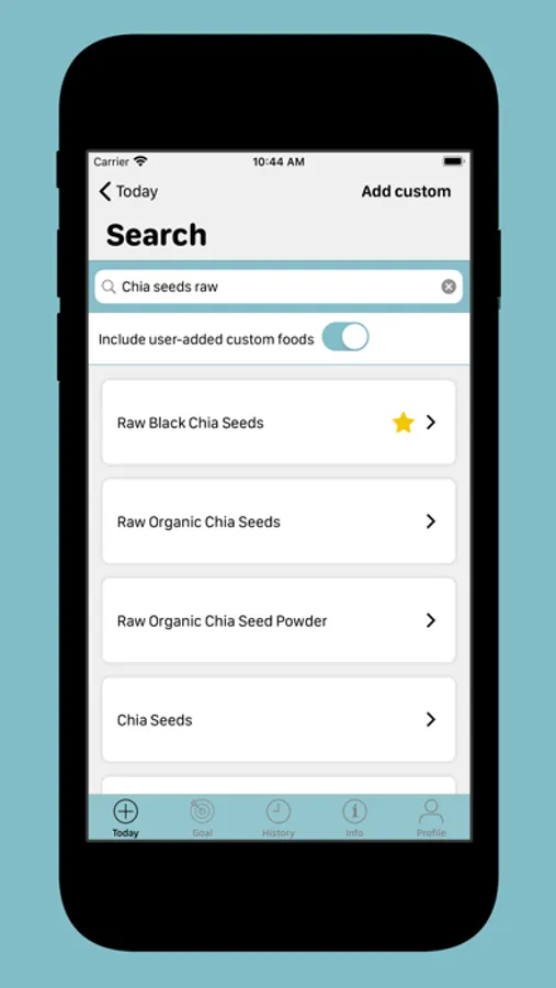 You can also add your own custom foods if you don’t find the right ones in the list and mark foods as favorites for quicker access next time.