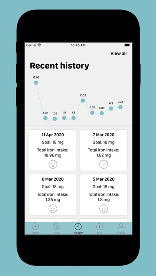 It also shows your history so that you can see your progress or just be aware of your dietary habits in terms of iron intake.