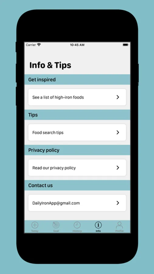 DailyIron also shows you a list of high-iron foods you can use to get inspired when in need of more to reach your goal.