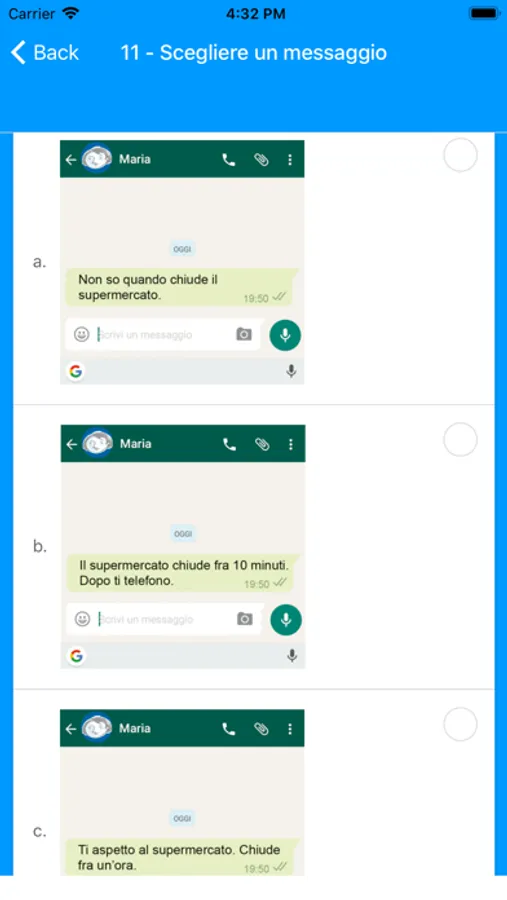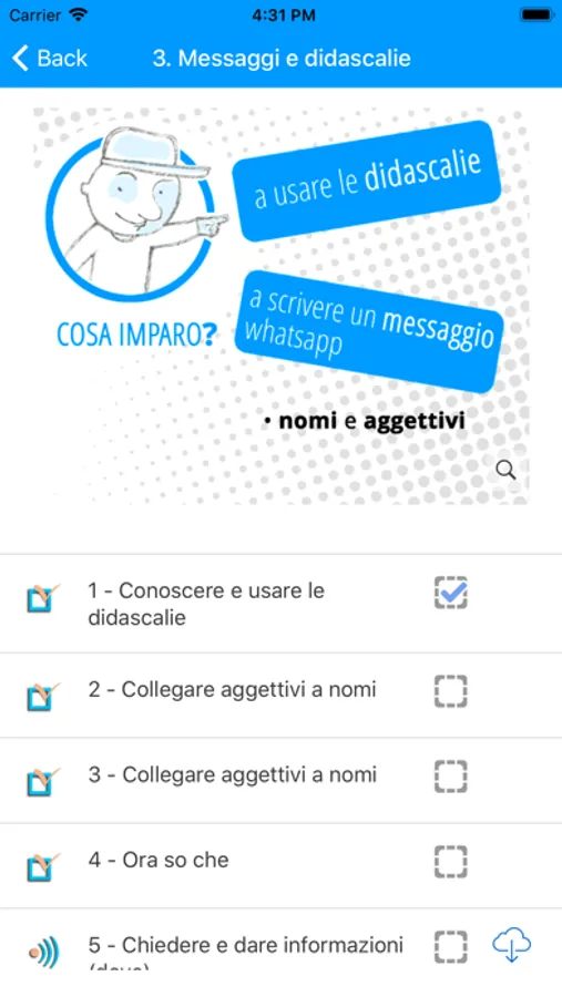 L’app propone una serie di esercizi a difficoltà crescente, che forniscono stimoli per l’apprendimento e restituiscono un feedback puntuale che consente di verificare immediatamente gli eventuali errori commessi.