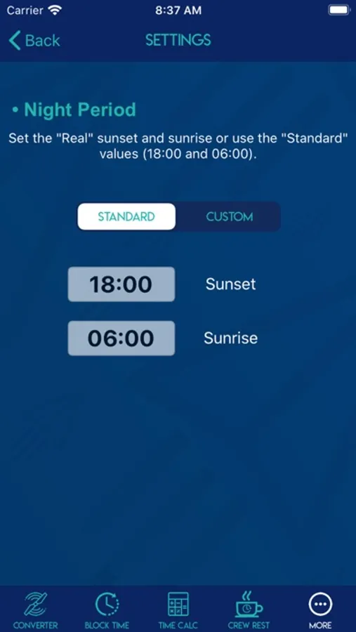 • Settings menu, allows you to adjust at which time will be the sunrise and sunset in order to calculate the Day/Night Block Time.
