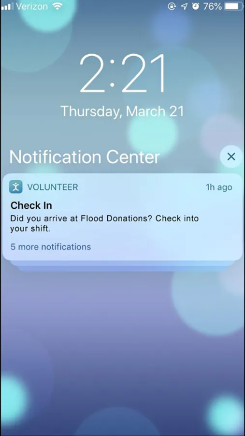 Receive push notifications when your volunteer shift is approaching and when you arrive on-site ready to check-in.