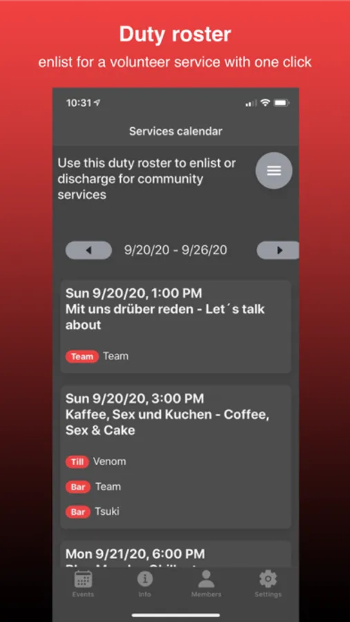 Association members can also access their member account and see an overview of their registered community services. In the "duty roster" you can enlist for or discharge from services like bar shift or entrance. You may also register a private usage of our association's rooms.