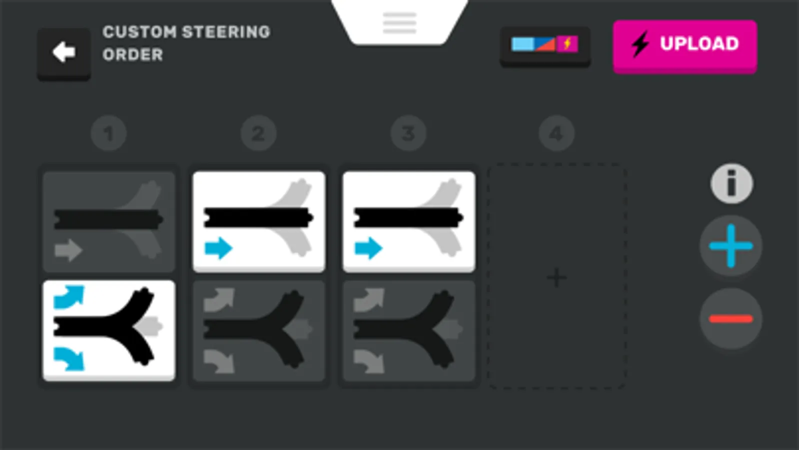 Similarly, you can use the editor for route planning. You can create a steering decision sequence of turning or driving straight and upload it to the train. Then every time when the smart train detects the magenta snap of a split track, it will use the next decision in your sequence. The sequence can contain up to 10 decisions and the train will continuously loop over it while it is driving.