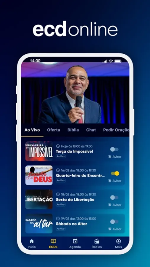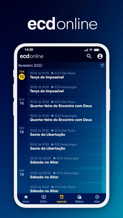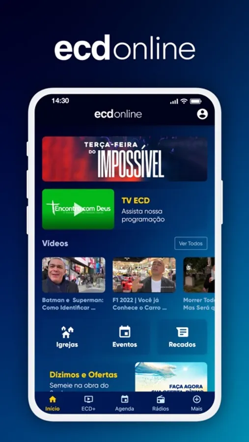 Na Plataforma do ECD Online você encontra a Bíblia, encontra a sua forma de Doações, Chat para sua alma 24h por dia, Horário e Endereços dos Cultos e Muito Mais!