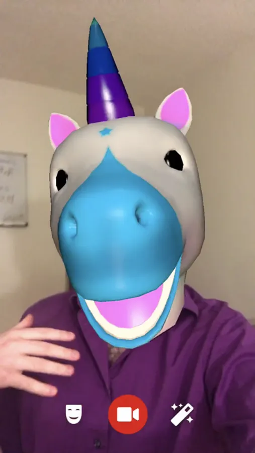 In addition to a moji where you can customize your face, skin, hair, eyes, and lips with different shapes, colors, and styles, you can also choose an animal moji including a unicorn, cat, dog, dragon, robot, dolphin, panda, rabbit, parrot, wolf, giraffe, and bird.