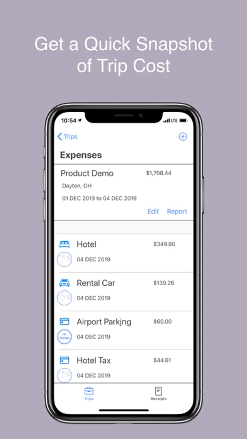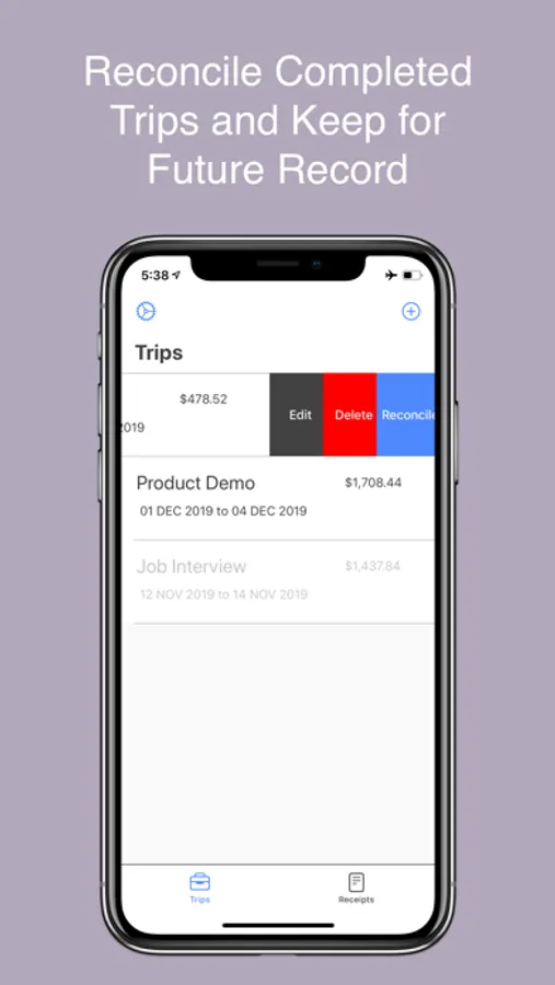 Reconcile makes travel expense management easy. No clunky text recognition, no subscriptions, and no external account integrations. Create a trip, and add your trip expenses as you go. Add receipts and associate each receipt to one or more expenses. At the end of your trip, export a PDF report that details expenses by category. Simply swipe to reconcile trips as they are completed.