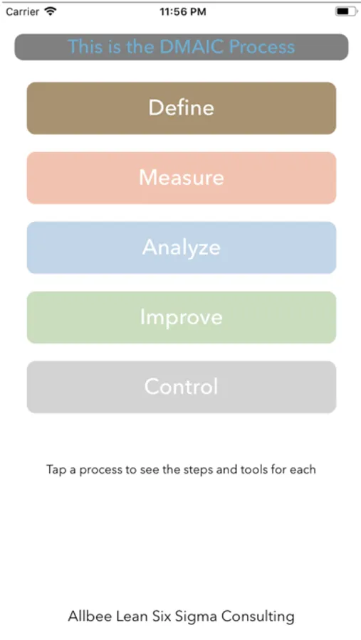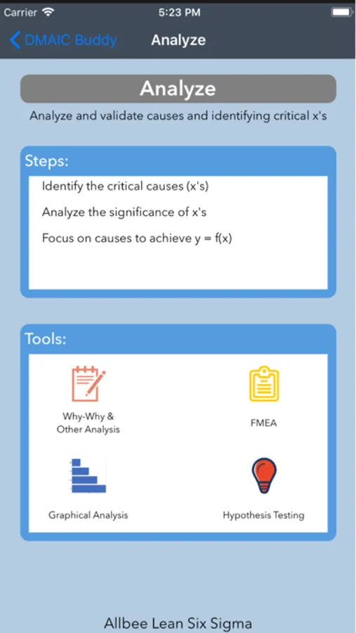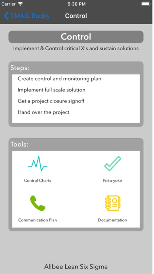 Have you ever been in a meeting and just couldn't remember the tools you use in the Control step? Have you simply forgotten what the A in DMAIC stands for? The DMAIC Buddy is here for you always at the tip of your finger!