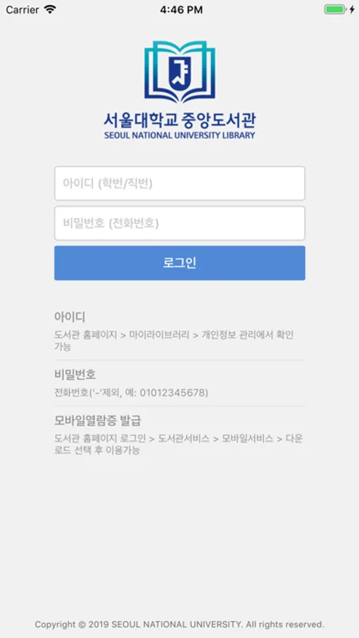 도서관 출입, 도서관 대출, 좌석배정 등 도서관 서비스가 가능합니다.