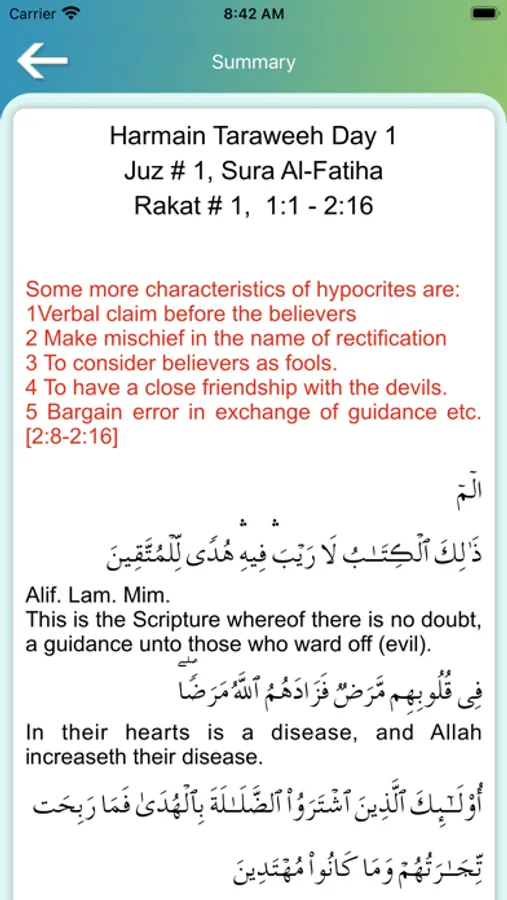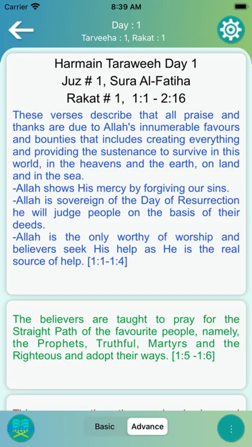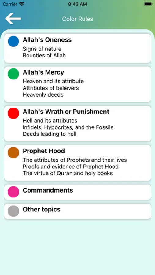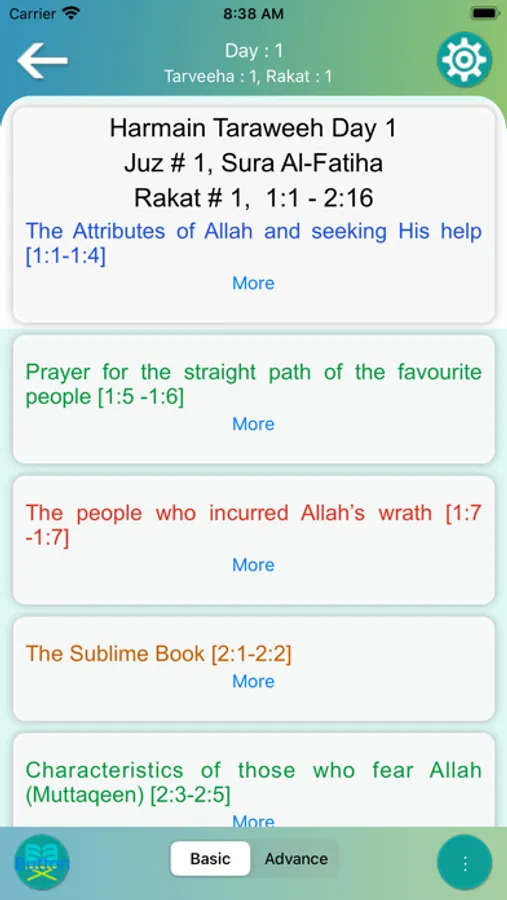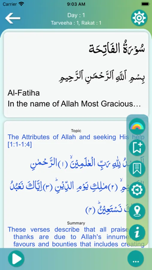 Taraweeh and quran connector helps its user to segregate the Aayaahs by theme and encode them by various defined colours followed by an introduction of the topic as well as its summary for a better understanding of the subject while listening to the recitation. The colour codes denote the theme in the Aayaahs such as Allah’s Oneness, Allah’s Mercy, Allah’s Wrath or Punishment, Prophethood or Commandments.