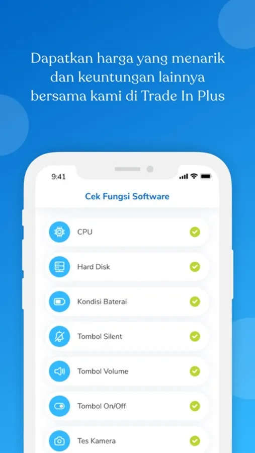 Aplikasi Trade in Plus membantu kamu untuk melakukan diagnosa dan valuasi smartphone kamu secara update & akurat serta memudahkan kamu untuk tukar tambah di toko-toko yang berpartisipasi.