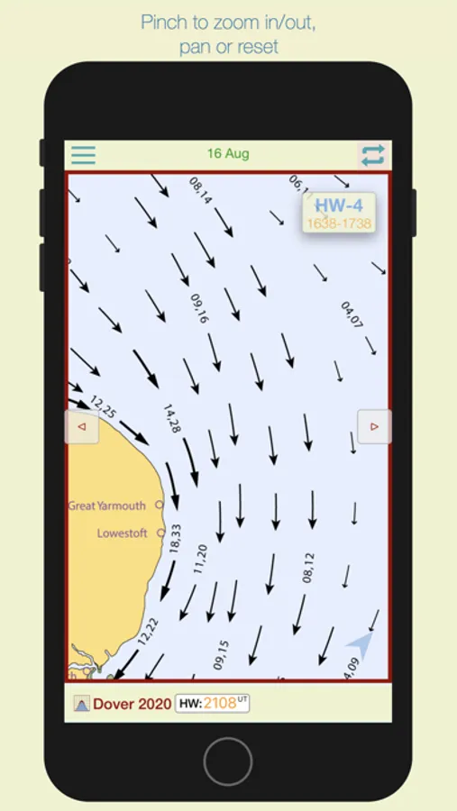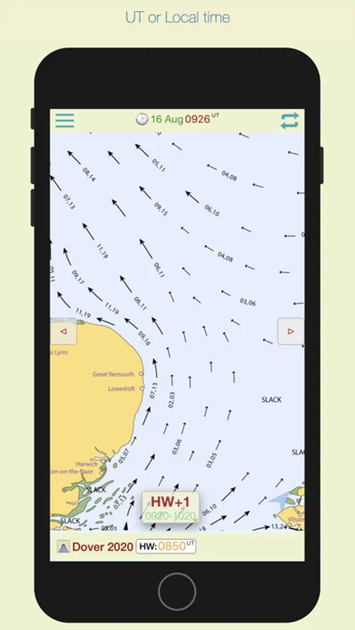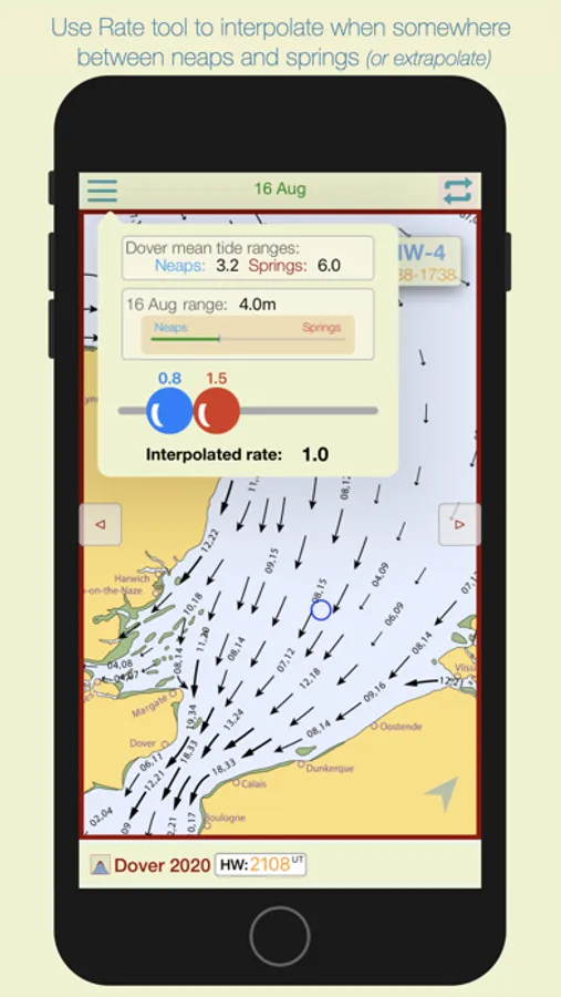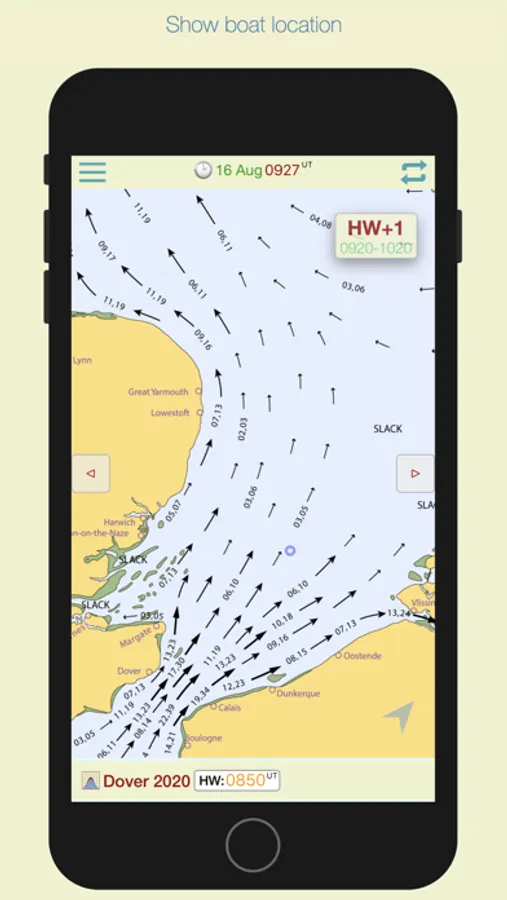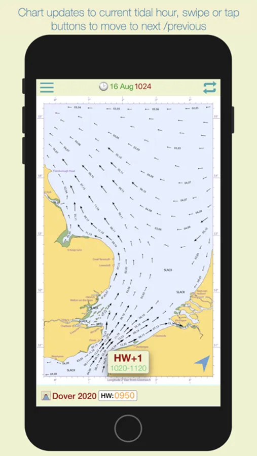 The app automatically selects the nearest Dover HW time of the day, but if you want to see data for the next or previous HW of the day, swipe forward or back to advance the tidal hour.