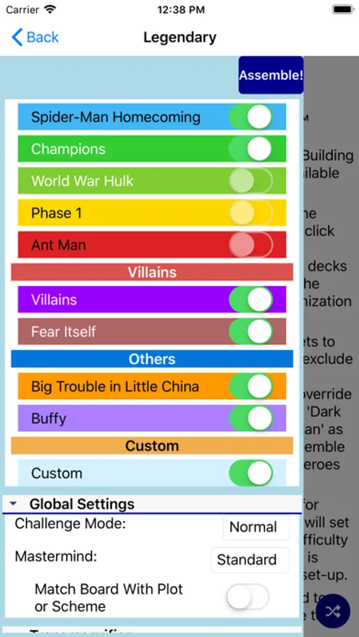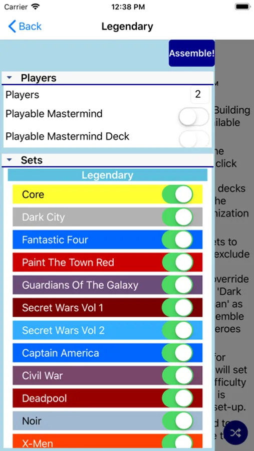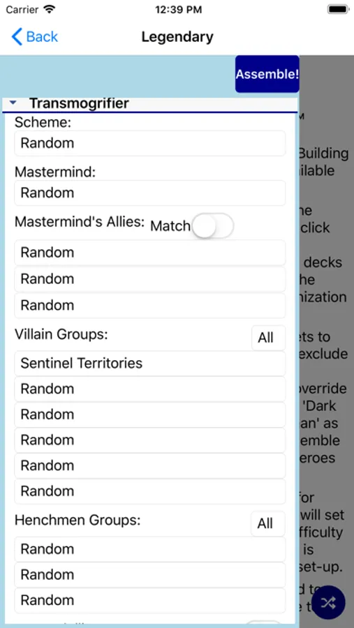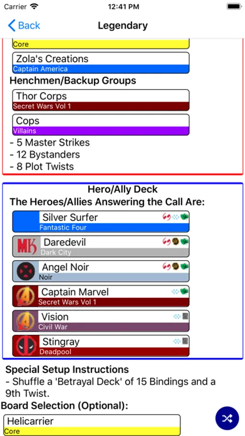 A Randomizer for Legendary and Legendary: Encounters. Includes all the sets, and also allows crossover between Legendary and Encounters. Many options to choose from - which sets to use, pick specific card sets or by category, also excludes ones you don't want.