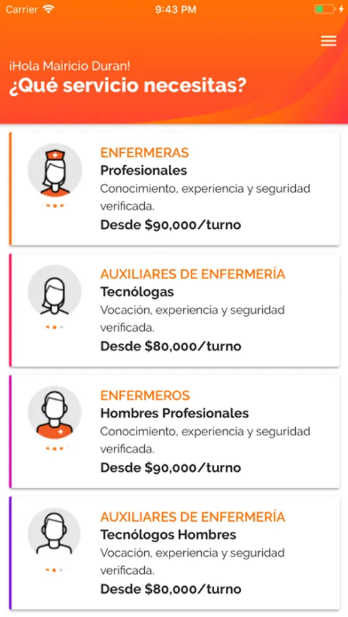 Eliges el perfil del profesional, diligencias los datos de quien recibirá el servicio, agendas y pagas, todo en 4 pasos. En seguida los profesionales disponibles aceptan tu servicio y en minutos recibes en tu celular los datos de quien cubrirá los turnos.