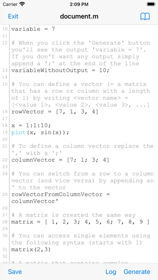Anoc is an Octave Editor (Matlab clone) for your iOS device. It allows you to create and manage Octave projects directly on your iOS device and generate the result and plots by using Verbosus (Online Octave Editor).