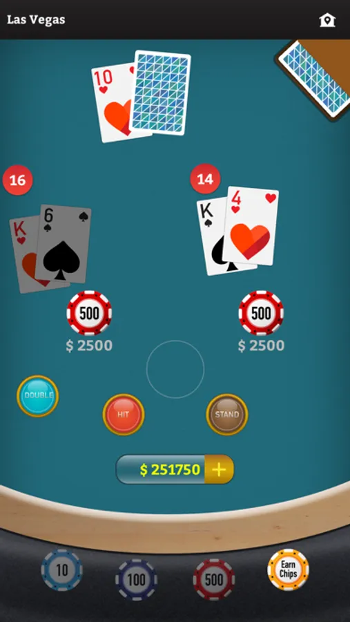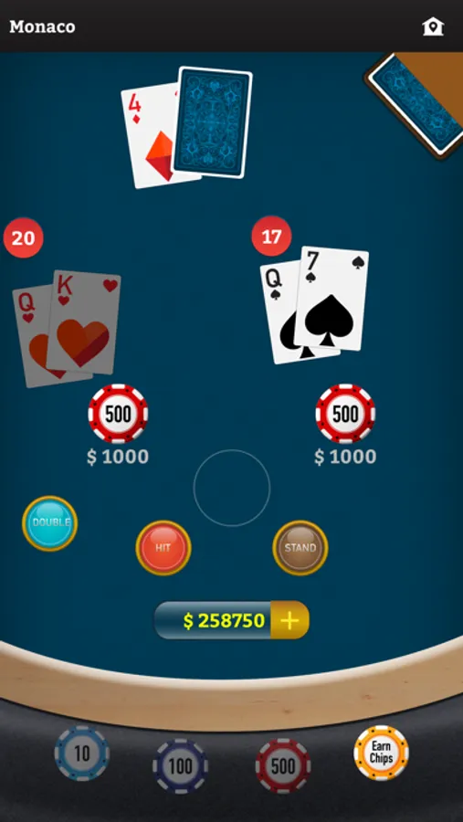 Double - when you have enough chips, you can tap "Double" to double your initial bet & you'll stand after getting one more card.