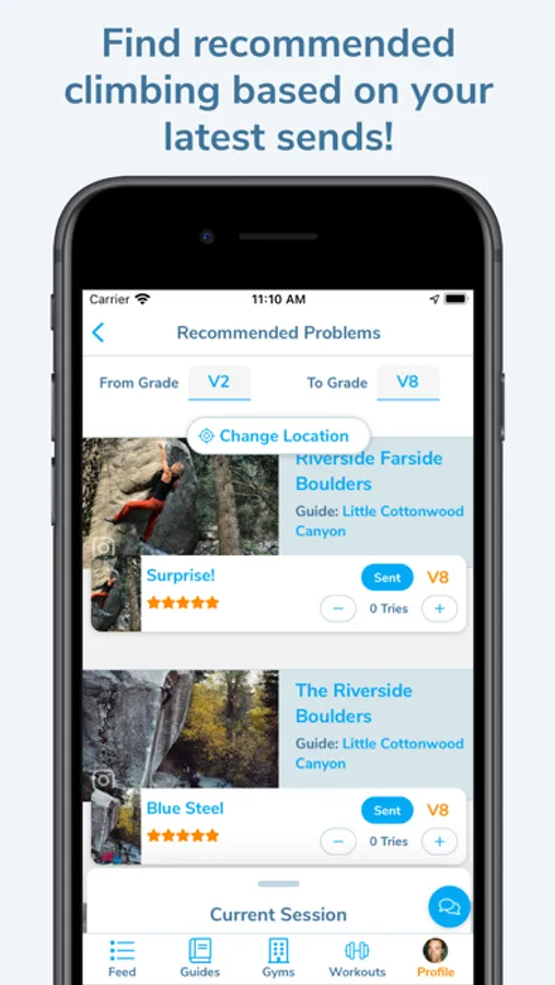 Once you log your sends and complete workouts, Pebble will begin recommending certain climbs to you. You can get recommendations based on a specific gym, guide, or even location.