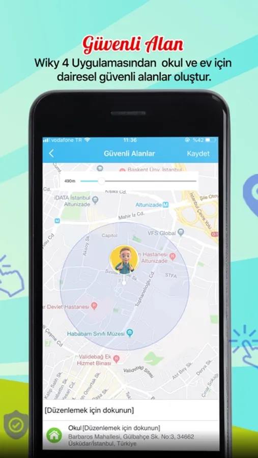- Güvenli Alan: Wiky 4 Uygulamasında ayarlar bölümünden okul ve ev için dairesel güvenli alanlar oluşturabilirsiniz. Çocuğunuzun bu alanların dışına çıkması veya içine girmesi halinde telefona gelen bildirimler ile bilgi sahibi olursunuz.