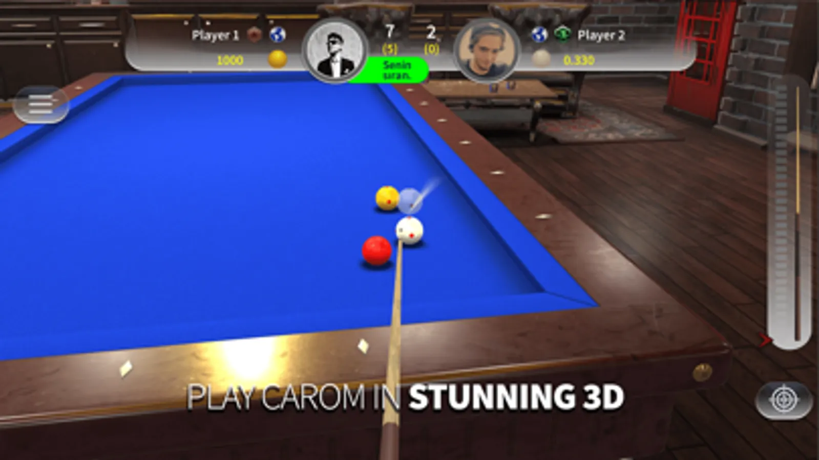- Enjoy carom and 3 cushion billiards with gorgeous 3D graphics and realistic physics