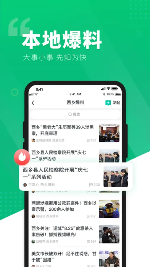 本地(同城)便民生活服务类社交应用,实时提供同城热点新闻、二手交易信息、亲子、租房、交友等信息,是本地人必备的生活应用。