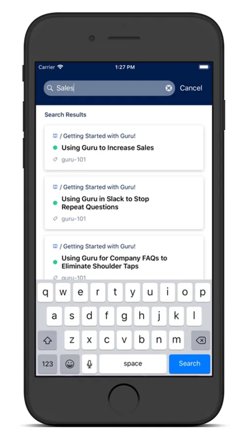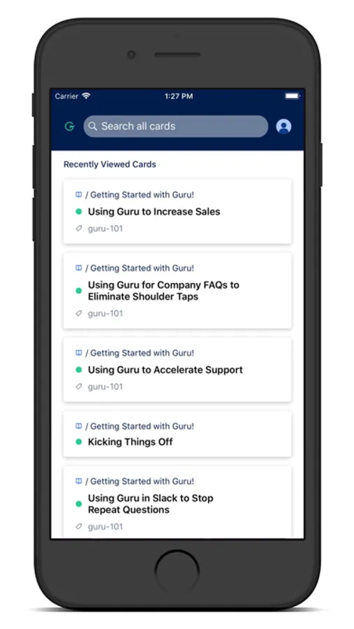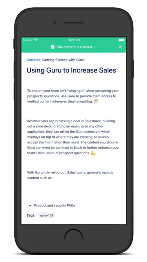 Guru’s iOS app empowers customer-facing teams to get the context they need to respond to sales inquiries, support questions, and other client communication. Use Guru to find and share collateral, support content, and troubleshooting guides to improve CSAT and resolve issues faster. Guru’s iOS app ensures the information you need is accessible wherever you have your phone.