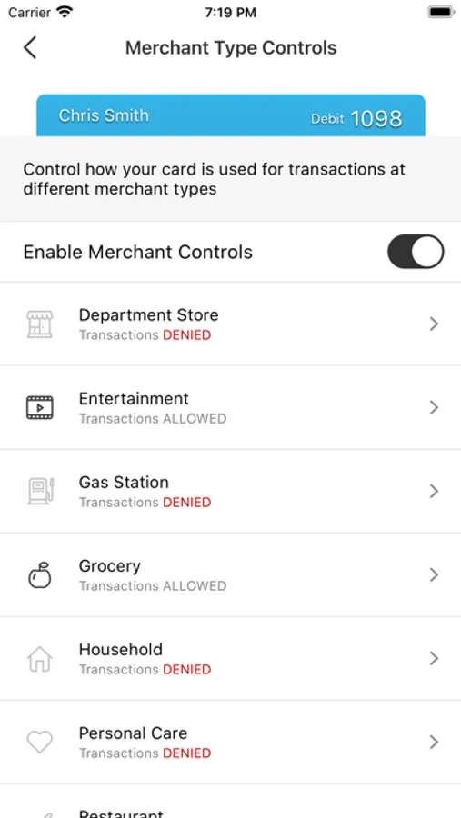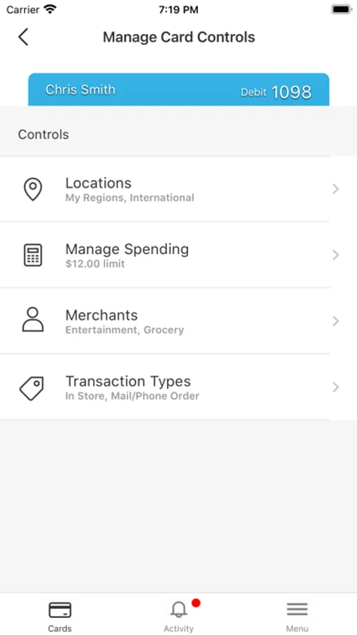 Set spending limits to decline transactions above your thresholds. Monitor activity by category such as gas stations and restaurants, as well as by type (in-store purchases, e-commerce transactions and ATM transactions). Alerts are in real-time, immediately after a transaction has been completed or declined.