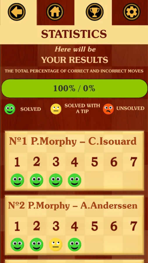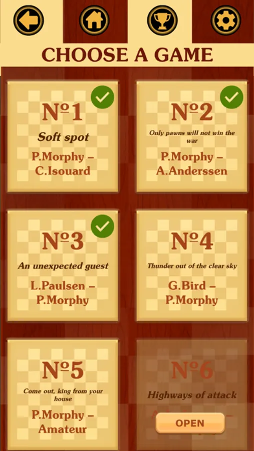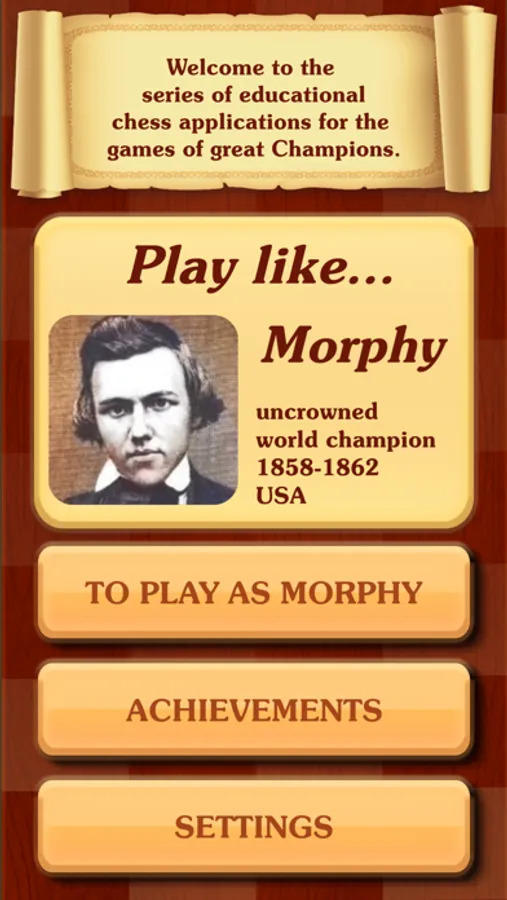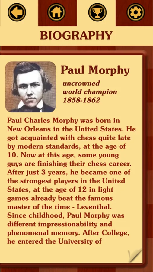 You have to study 50 commented games of chess legend-Paul Morphy. In each game there will be tasks where it is necessary to find a move or the whole variation of the great Maestro, "to play like Morphy".
