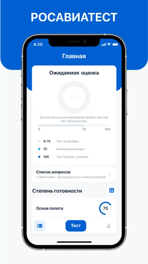 Построенное на базе платформы ПРОАВИАТЕСТ®, приложение Росавиатест - это база вопросов, ответов и решений для самоподготовки к государственному тестированию на получение свидетельства для авиационного персонала в России. Платформа ПРОАВИАТЕСТ® дала возможность: