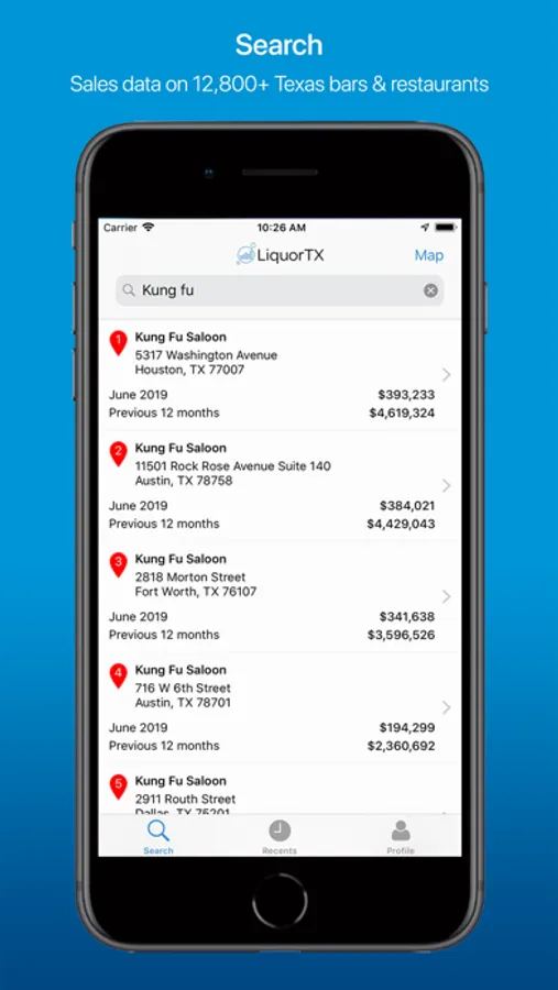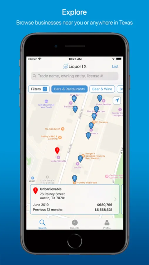 Use the LiquorTX app to see liquor sales for all bars & restaurants in the State of Texas (over 20,000 to date). Search by name or browse businesses in Map View, then click on a business to view up to fifteen years of sales data, permit owner, permit expiration date, and liquor/beer/wine product mix.