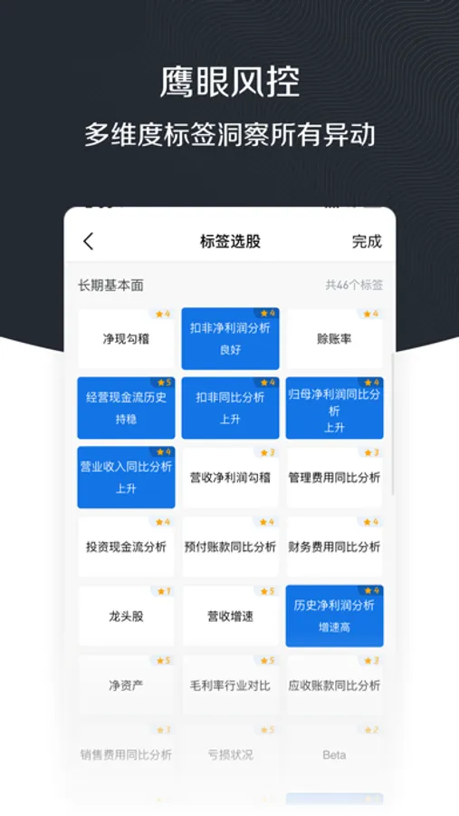 4)鹰眼风控:巴菲特选股,蓝筹股,外资认可,鹰眼异动榜,帮你筛选风险收益更高的股票。